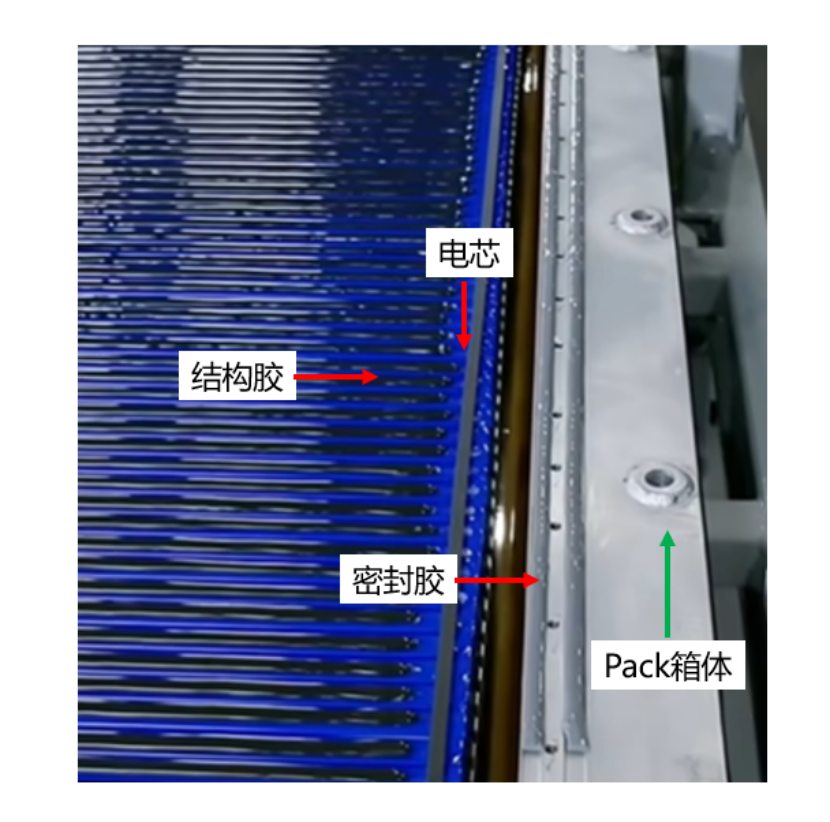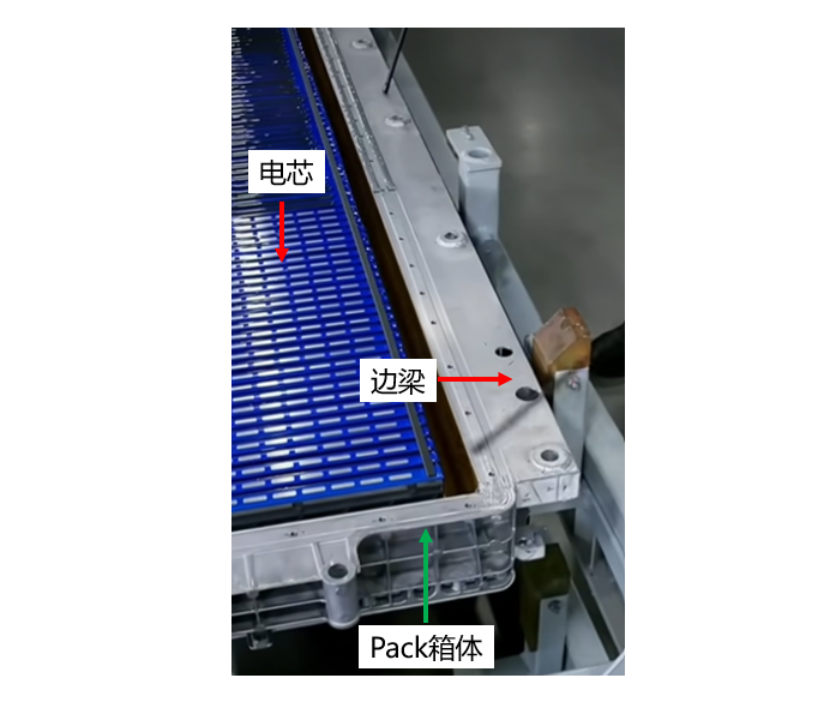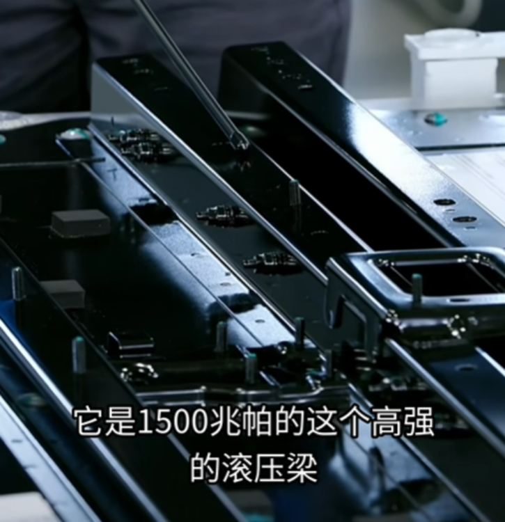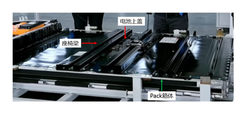 Once the adhesive application is finished, the battery pack cover is installed, which incorporates a 1500 MPa roll-formed seat beam. This beam enhances the torsional stiffness of the battery pack and, when combined with the vehicle’s side sills, boosts the structural strength against side impacts.