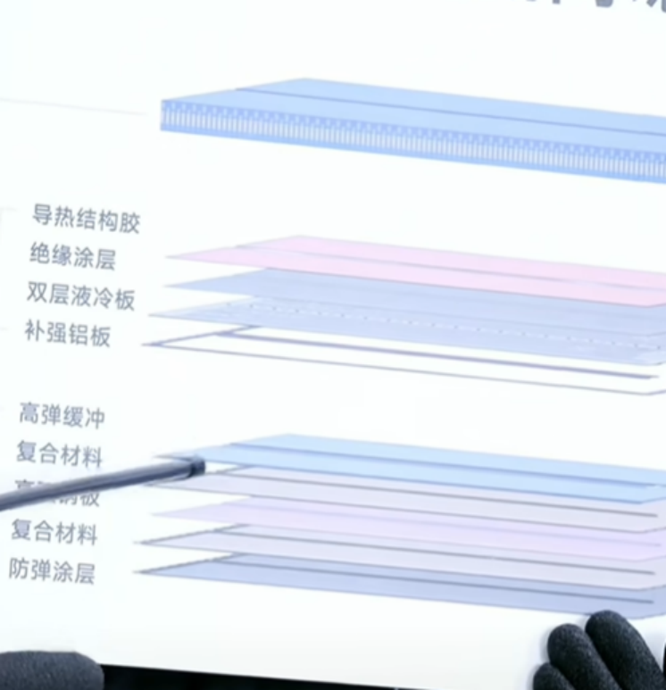 The image attached clearly shows the multi-functional composite layer beneath the cold plate, which includes a high-elastic buffer layer, a polymer composite layer, a high-strength steel plate and a ballistic-resistant bottom guard plate.