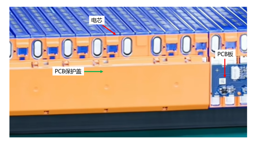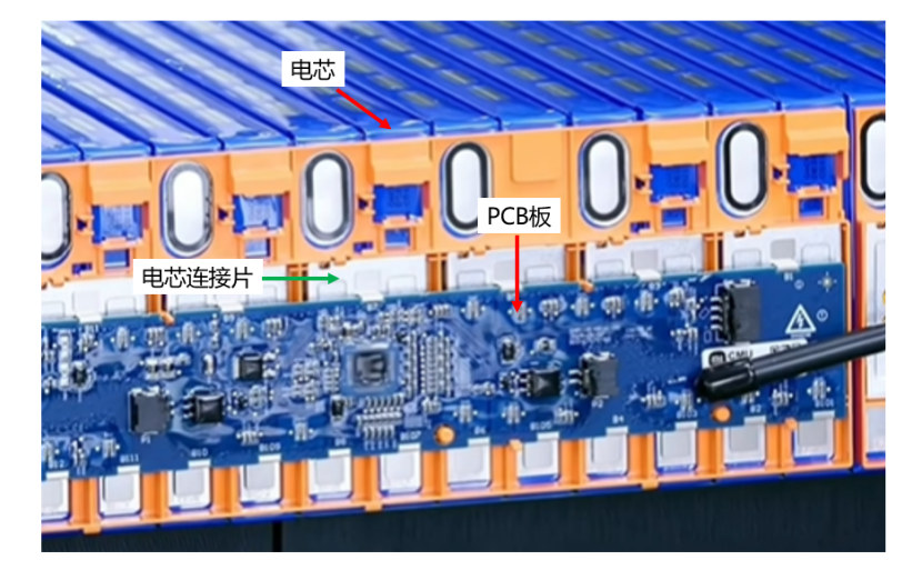 Next comes the installation of the PCB (Printed Circuit Board) for the CMU (Cell Monitoring Unit), which collects basic data such as cell voltage, current and temperature for real-time monitoring by the BMS (Battery Management System). The PCB is populated with a variety of electronic components, including capacitors, transistors, dispersers, inductors, IC chips, resistors and connectors.